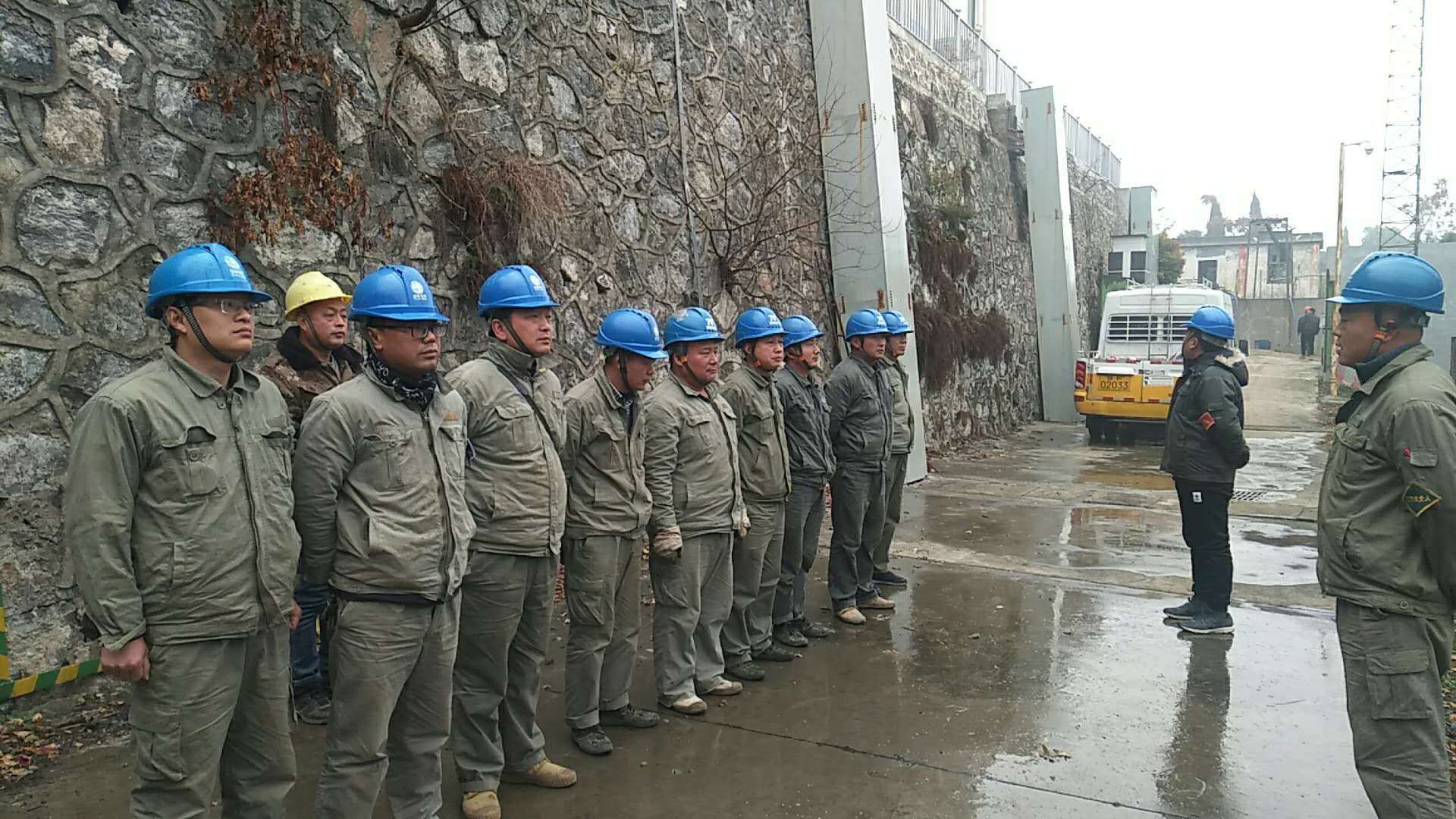 圖二:某變壓器增容改造項目現(xiàn)場,施工人員頂著寒風(fēng)、冒著冷雨召開班前會。