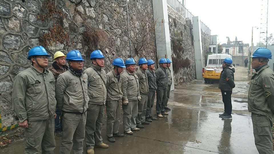 某藥廠變壓器增容改造現(xiàn)場,施工人員頂著寒風冒著冷雨召開班前會